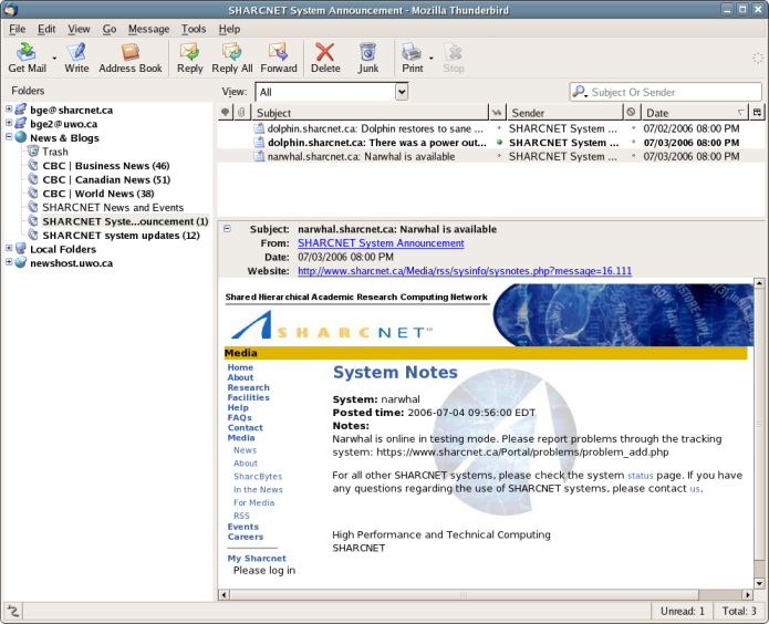 The following screen shot in Figure 1 shows a SHARCNET system annoucement showing in Thunderbird.