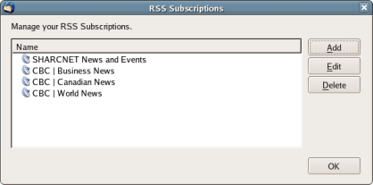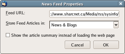 In a popped dialogue box, fill in the Feed URL entry the URL of the RSS feed, e.g. http://www.sharcnet.ca/Media/rss/sysinfo/, in a popped dialogue box, then click OK.
